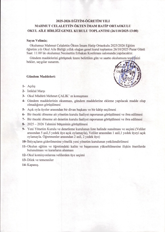 2025 2026 Eğitim Öğretim yılı Okul Aile Birliği yıllık olağan genel kurul toplantısı 26 Ekim Pazar Günü saat 11:00 de okulumuz konferans salonunda gerçekleştirilecektir.